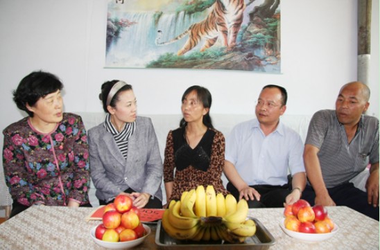 中國婦女發(fā)展基金會副秘書長朱錫生(右二)、青海省婦聯(lián)副主席謝瓊(左一)、方正集團副總裁兼首席品牌官魏亞歐(左二)一同看望郭玉蓮夫婦。郭玉蓮(中),樂都縣碾伯鎮(zhèn)土橋村宮頸癌患者。出院以來,身體素質(zhì)和精神恢復(fù)情況尚可,但目前無法正常從事體力勞動。